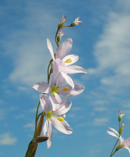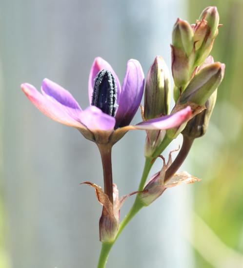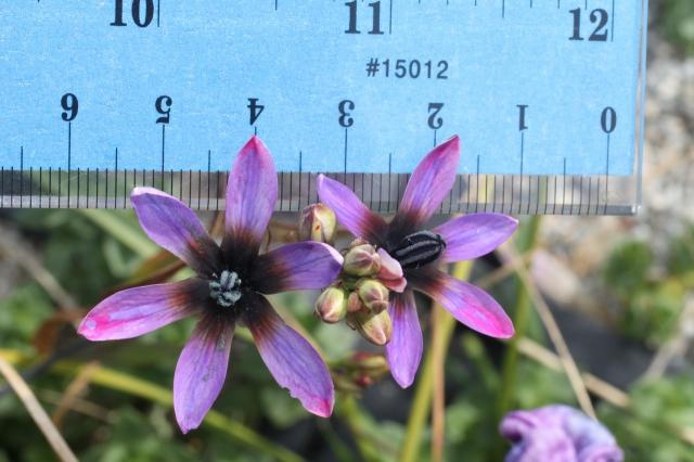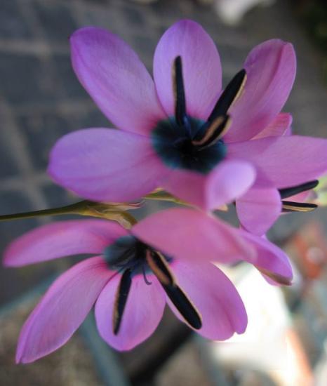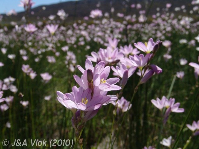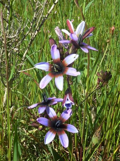 Ixia metelerkampiae L.Bolus grows on sandstone mountain slopes in the southwest Cape and blooms from November to December. It grows to 70 cm high and has pale pink to bluish mauve or purplish lilac flowers with a minute maroon central star sometimes outlined with white and small red marks at the base of each segment. Photos by Alan Horstmann, Mary Sue Ittner, and Rod Saunders.
