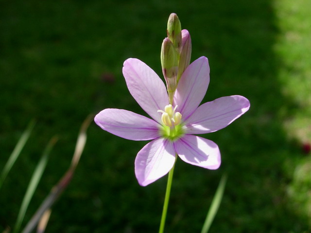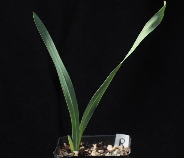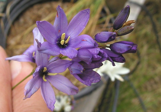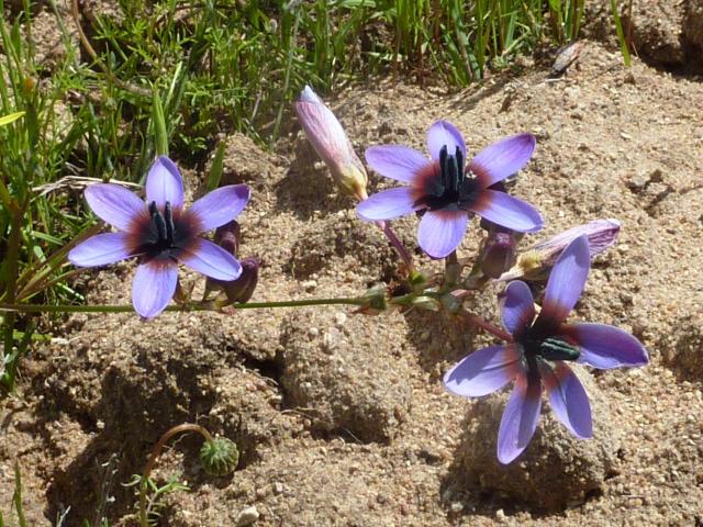 Ixia marginifolia G.J.Lewis is found on stony slopes in renosterveld in the Roggeveld. It is similar to Ixia rapunculoides with pale blue to mauve flowers, but has well exserted filaments. Plant height: about 75 cm. The first three photographs were taken near Middlepos by Bob Rutemoeller and Mary Sue Ittner September 2006. The fourth photo was taken by Alan Horstmann. The fifth photo of a second season seedling from Silverhill Seeds grown by M. Gastil-Buhl shows the leaves thickened at the margin and midrib.
