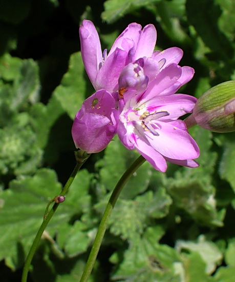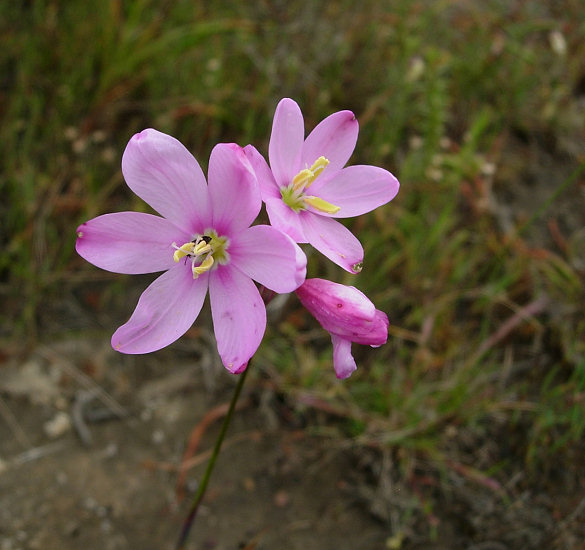 Ixia mostertii M.P.de Vos is known from three locations in the Upper Breede River Valley between Wolseley and Worcester. None of the locations was protected as of 2005, and the species was considered endangered. Flowers vary from white to deep pink, with a dark blue, purple, or blue-green center. Height: to 45 cm. More information is available here. The first photo is from Gordon Summerfield. The next two photos from iNaturalist were taken by Patrick Lane near Worcester in September and shared under a CC BY-NC license.