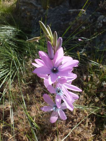 Ixia orientalis L.Bolus grows on flats and slopes in winter and summer rainfall areas and flowers in spring. It is the only species that extends into the Eastern Cape. Leaves are narrow and flowers are cream to mauve-pink and filaments are exserted. Height range: 25-70 cm. The first two photos from Cameron McMaster were taken in the Eastern Cape. The second one was taken at Gaika's Kop. The third photo from the book Plants of the Klein Karoo courtesy of Jan and Anne Lise Schutte-Vlok. It is abundant in the Little Karoo.