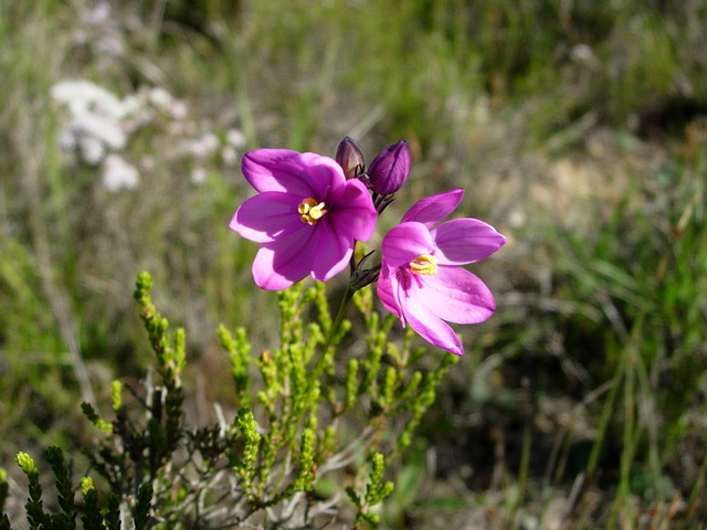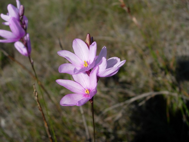 Ixia micrandra Baker grows on rocky sandstone slopes and flats in the western and southern Cape. It has a short spike of 2 to 6 white to pink or mauve flowers with short exserted stamens and spreading tepals. The anthers are oblong. Height: 25-50 cm. Photos taken by Cameron McMaster in Bredasdorp, Napier, and Drayton in the Overberg.