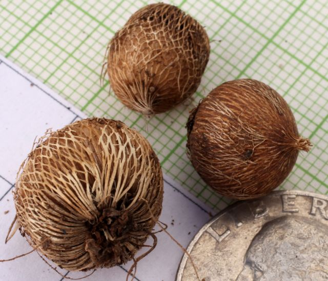 Ixia monadelpha D.Delaroche has flowers that are violet, mauve, pink, apricot or white, rarely yellow, all with a contrasting center which is outlined with a circle of still another color. It flowers in spring and is found on wet sandy flats in the southwestern Cape. Height range: 15-40 cm. The first photo from Bob Rutemoeller is looking a little less than perfect after a fair amount of spring rain. The second photo by Mary Sue Ittner is of a mustard colored one. Photos 3-5 by M. Gastil-Buhl show corms on a 1 mm grid, grown by Jim Duggan, who recommends part shade, and a flower from those same corms, grown in full sun. The flowers opened successively up a 10 inch (26 cm) spike, spanning over a week in April, opening each morning and closing at dusk. The leaves began to brown before the flowers bloomed.