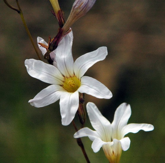 Ixia divaricata Goldblatt & J.C.Manning, syn. Ixia latifolia var. angustifolia G.J.Lewis, is found on seasonally wet, stony sandstone flats and rocky sites in the mountains of the southwestern Cape. Growing to 50 cm, it is distinctive from other genera once included in Ixia latifolia by its unusual branching pattern. The stiff, straight lateral branches are held at angles of 30 to 50° to the main axis and bear mostly 3-5 white to pale pink erect flowers crowded distally. Filaments are usually shortly exserted from the tube. Plants flower in spring. The first photo was taken by Rod Saunders of Silverhill Seeds. The other photos from iNaturalist were taken by Nick Helme in October and November in the Western Cape and shared under a license.