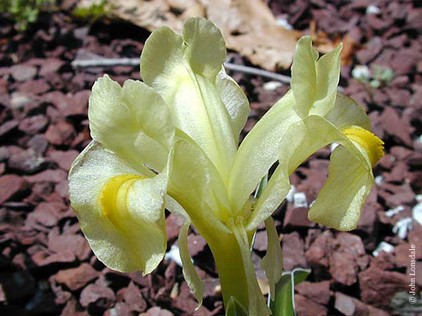 Iris caucasica M.Bieb. grows on mountain slopes in Turkey and the Caucasus. Leaves are gray green and flowers yellowish green with a yellow ridge on the falls. Height: 20 cm. The first two photos by John Lonsdale. Photo 3 taken in northeastern Turkey by Jane McGary showing plant in flower just after snowmelt.