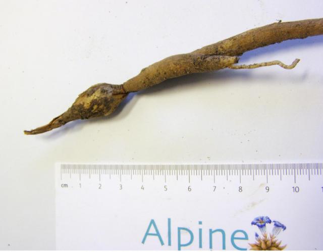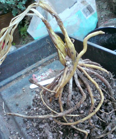Iris fosteriana Aitch. & Baker from the dry steppe of NE Iran to NW Afghanistan is a spindley juno with a slim bulb with a long neck, growing to about 30 cm. The form Peter Taggart grows has a hard outer tunic on the bulb which is a warm cream colour while the inner tunics are very thin, papery, and saffron yellow, as is the bulb. The tuberous roots are long, perhaps 6 inches, thin and white. They radiate outwards from the basal plate. The leaves emerge early (December) and are narrow and deeply channeled, near vertical then at March flowering time the leaves curve outwards, grey below and green above with a white edge to the leaf. The flower stem shown is unbranched and hidden by leaves until fruiting. There is no aril on the seed. Photos by Peter Taggart show the flower, then bulbs above tuberous roots. The third photo compares bulbs of I. fosteriana (left) to I. cycloglossa (right).