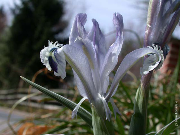 Iris graeberiana Sealy from Central Asia is blue tinted violet or lavender and strongly veined around the crest. It is an easy vigorous juno that only gets to 6 to 8 inches tall. Here it is blooming on April 5, 2006 in the USDA zone 7 garden of Jim McKenney.