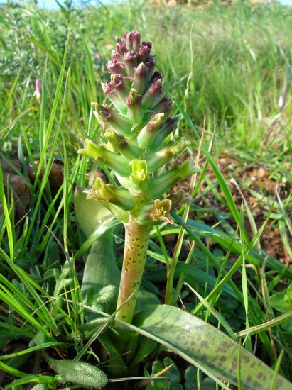 Lachenalia orchioides (L.) Aiton is a variable usually montane species often found growing in heavy soil in partial shade in large colonies. Growing from 10 to 40 cm high, it has 1 to 2 lanceolate or strap-shaped leaves and sessile flowers with anthers included. It flowers August to October. There are three accepted subspecies.