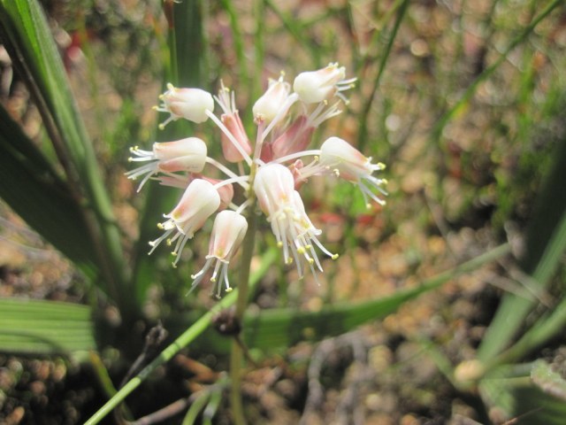 Lachenalia polypodantha ssp. eburnea G.D.Duncan has a glaucous curved leaf with a grooved upper surface and ivory white inner tepals with green or brown keels and white filaments. It has a more limited distribution near Gamoep in western Bushmanland. Photos from Alan Horstmann taken in October.