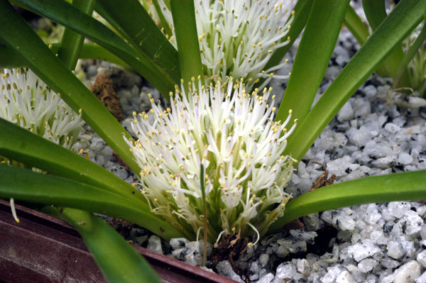 Lachenalia pusilla Jacq. is a short plant with white flowers that are borne at ground level in a congested raceme. Height: 1-4 cm. The four to six leaves are produced in a prostrate rosette and may vary in shape from linear to lanceolate and are plain or spotted. The peduncle or main flower stem is very short resulting in flowers opening at ground level. This appearance is probably why the species was at one stage included in the genus Polyxena. Because of its geometry this species is probably best suited to cultivation in pots or raised containers. As the seed matures the peduncle extends raising the seed capsules above the plant to presumably aid in seed dispersal. Information from Don Journet. The flowers have a scent that resembles coconut. It blooms in the fall and is common on sandy flats and slopes in the winter rainfall areas. the first two photos were taken by Mark Mazer and the next two by Cameron McMaster taken near Napier in the Overberg. His second photo shows the plant in seed. The fifth photo is from Rod Saunders. The last photo from Mary Sue Ittner gives an idea of how small these plants are as there are a number of plants in bud and bloom in a pot.
