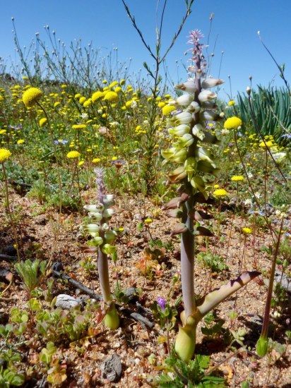 Lachenalia marginata W.F.Barker grows in fynbos in acidic sand or gravel on flats and lower to medium slopes in the northwestern Cape (Bokkeveld Plateau to Clanwilliam). Growing from 11 to 30 cm high, it has one ovate or lanceolate clasping leaf, marked brown or green, and sweetly scented greenish-yellow flowers with dark brown markings. Flowers are sessile with stamens included. It flowers June to September. Photos from Alan Horstmann. The first photo was taken in the Cederberg Mountains. The next two photos were taken south of Vanrhynsdorp.