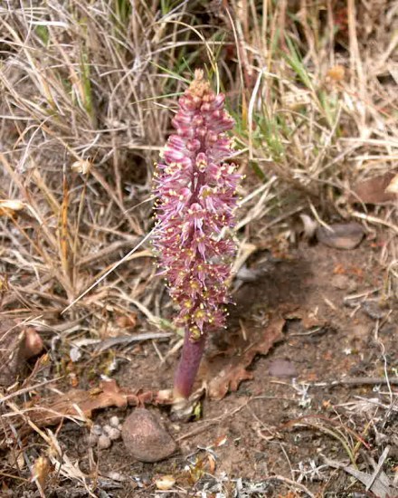 Lachenalia nardousbergensis G.D.Duncan has a limited distribution in fynbos in the Western Cape from Nieuwoudtville to the northern Cederberg, with one more outlier in northern Piketberg. It has two prostrate olive green pustulated leaves and campanulate magenta flowers with exserted stamens and grows to about 30 cm tall. It flowers late August to early October. The first photo was taken by Margaret Fox. The next four photos were taken by Alan Horstmann.