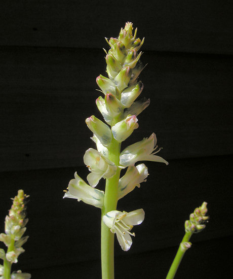 Lachenalia arbuthnotiae W. F. Barker is found on marshy flats in the Southwestern Cape where it grows from 18 to 40 cm high. According to Don Journet this species flowers for him from late August through to early November with showy yellow flowers that turn a dull red as they age. The spike is quite dense and generally longer than many, and the flowers are upwards of horizontal with a pedicel that is so short the flowers almost clasp the rachis. With the added attraction of scented flowers, this species would have to be regarded as one of the most desirable in collections. Besides the yellow form, he also grows one that has almost cream flowers which also turn dull red on aging. Photos by Alan Horstmann.