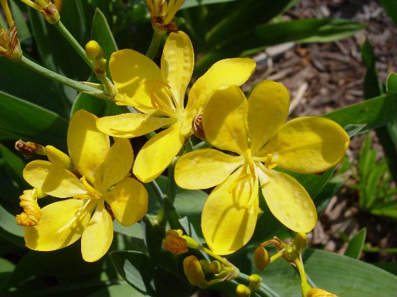 Iris domestica, commonly called Blackberry lily, Leopard flower, and also known as Belamcanda chinensis, among other names, has been moved around taxonomically for many years. Recently DNA studies determined that it is actually an iris. Plants may blanket hillsides. Flowers are red to orange to yellow, summer flowering, with seeds ripening in the fall, shiny black and clustered like blackberries, hence the common name. Plants grow 24 to 36 inches tall. It has naturalized widely in the eastern half of the United States. It is Chinese in origin, where it has been cultivated for centuries if not millennia; WHZ 4-10.