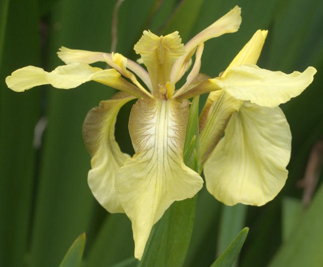 Iris × flavescens, lemon-yellow iris, is a cultivar of collected, probably hybrid, origin. It is seen along roads in Kansas, in Ohio, in old yards, cemeteries, sometimes just scattered. In Jim Waddick’s words, it is "old, sturdy and long-lasting." Dennis Kramb gave plants that are probably this hybrid that had naturalized where he lived the name 'Wild Lakota'. See photos below for an illustration. Pennsylvania, Kentucky and Illinois have known populations. It is to be expected elsewhere; WHZ 3-8.