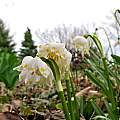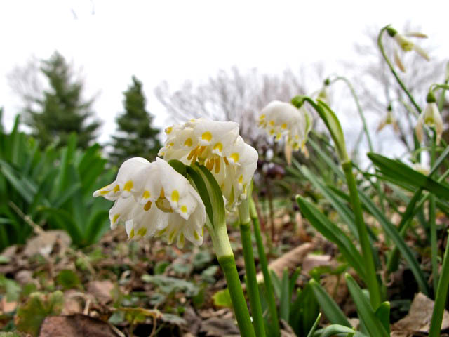 Leucojum vernum var. carpaticum Sweet differs from the typical species in having yellow spots at the edge of each floral segment. It is native to Ukraine, Romania and Czechoslovakia. The cultivar 'Gertrude Wister' is special because of its additional petals. This cultivar is believed to have originated from the Wister garden at Swarthmore College, Swarthmore, PA. It is registered with the KAVB. It blooms for Jim Waddick in Kansas City, Missouri in Early March. The following three photos of 'Gertrude Wister' are by Jim Murrain.