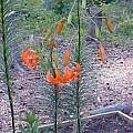 Lilium davidii Duch. ex Elwes is a lily from China. It flowers in summer and has orange flowers that are spotted. This bulb is eaten in China. Height: to about 5 ft. Photos 1 to 3 from Darm Crook. Photos 4 and 5 were taken by Ron Parsons of plants in Mary Gerritsen's garden.