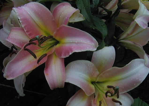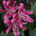 Lilium 'Leslie Woodriff'' is an Oriental Trumpet hybrid, created by Robert Griesbach by crossing tetraploid forms of L. 'Black Beauty' and L. 'White Henryi' and named for Leslie Woodriff, the legendary lily grower. See L. 'Stargazer'. It has frequently topped the NALS popularity poll and grows around 8 feet high. Photographs taken by David Pilling in the middle of August in North West England.