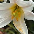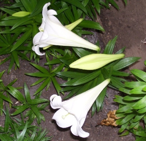 Lilium longiflorum Thunb. is the ever popular "Easter lily" which has been highly hybridized. The species is native to Japan; it can survive zone 1 winters out doors but if left in those conditions it will deteriorate and then disappear after the third summer. When grown in conditions to its liking, it is a robust lily growing up to 90 cm (3 feet) tall and producing clones that will flower the same year they were produced. Although related to Lilium formosanum and Lilium philippinense, it will accept a cool forced dormant period after which it will grow as vigorously as it always has. The florets grow in an umbel inflorescence and are white with a yellow throat and nicely scented. The first photo is one that was set behind the apple tree several years ago and forgotten. There are three stalks and nine flowers all open at the same time. It was grown in Long Beach, CA by Doug Westfall. The second photo of this species was taken by Janos Agoston. Photos three to six were submitted by Darm Crook.