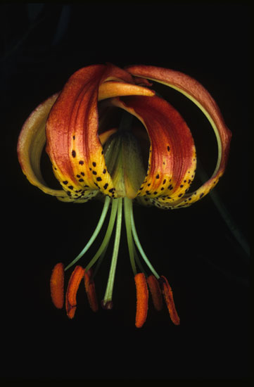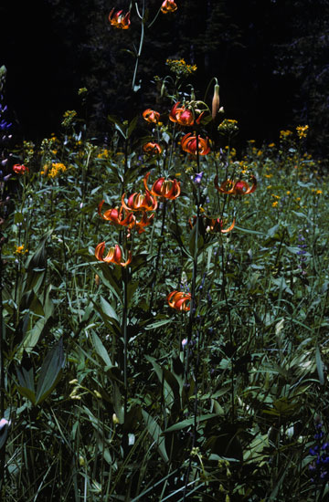 Lilium pardalinum Kellogg is native to the Pacific Coast (southern Oregon to southern California.) It is a woodland species, often found growing near streams. Height: to 8 ft. The first four photos were taken by Bob Rutemoeller. The first three were taken July 2002 where it is growing near the Gualala River in California in exactly that habitat. The fourth photo shows it flowering around the same time growing in a large container. The fifth photo, by Ron Parsons, was taken of a plant in the wild, in Shasta County, California, July, 2006.