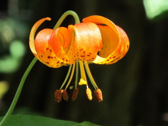 Lilium pardalinum ssp. wigginsii (Beane & Vollmer) M.W.Skinner (syn. Lilium wigginsii Beane & Vollmer) is native to the Siskiyou Mountains in Northern California and southern Oregon where it grows at higher elevations. It has no bulb but instead it grows from a thick rhizome covered with small scales. This lily will grow up to 120 cm (4 feet) tall with whorled foliage. The florets are on long pedicels, pendent, fully recurved, yellow with purple to brown light to heavy spotting, and yellow pollen. The first photo below from Ron Parsons is from a wild population in Siskiyou County, California. Photos 2-6 are from Darm Crook.