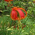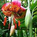 Lilium pardalinum ssp. pitkinense (Beane & Vollmer) M.W.Skinner syn. Lilium pitkinense Beane & Vollmer is known from only two populations near Sebastopol, California. It is distinguished from the other taxa by smaller segments, elliptic leaves, red to orange-brown pollen, and magenta anthers. Height: 3-6 ft. The first two photos by Bob Rutemoeller illustrate the first bloom for one growing in a container. It is threatened by habitat loss, competition, and collecting. Photos #3-4 were taken by Ron Parsons of plants in cultivation.