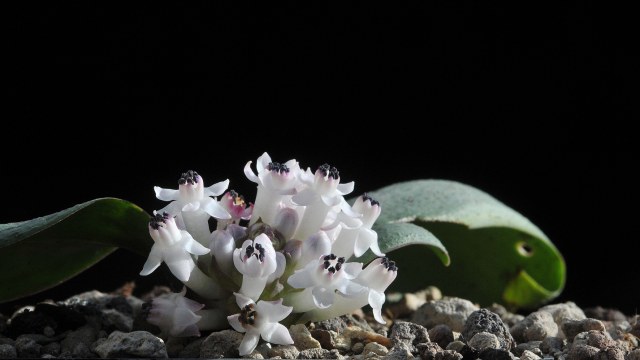 Massonia latebrosa Masson ex Baker is known from Karoopoort and since 2019 also from Konstabel railway station, 70 km more east. The species relates to M. echinata from Oorlogskloof but can be distinguished by the purple streaked leaves bearing typical inflated trichomes like little balloons. M. depressa shows similar flower morphology to M. echinata and M. latebrosa, but M. depressa differs by the smooth leaves and the larger flowers. Height: to about 5 cm. Photos 1-2 are from plants in cultivation taken by Hans Joschko. Photo 1 shows the typical inflated trichomes. Photo 3 was taken by Rob Scott in habitat at Karoopoort. Photos 4-5 were taken by Matt Fischel from plants found at Konstabel Station.