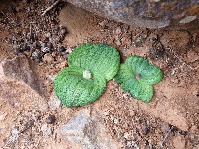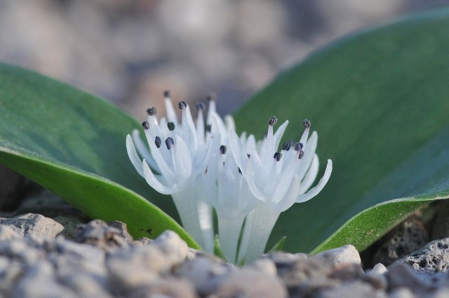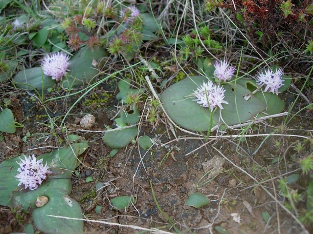 Massonia obermeyerae Mart.-Azorín, A.P.Dold, M.Pinter & Wetschnig was described in 2015. The distribution of M. obermeyerae is centered in the Eastern Cape province, with disjunct populations in the Western Cape near Calitzdorp and Hermanus and a further disjunct population near Kimberley in the Northern Cape. Different botanists see this species as the bridge-species between the genera Massonia and Whiteheadia. It has rather fragile succulent leaves and distinct flowers with strongly incurved thick filaments. Height: to about 5 cm. Photos below are from Rob Scott. Photo 1 is of a plant from Willowmore. Photo 2 is taken in habitat North of Klipplaat.