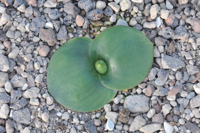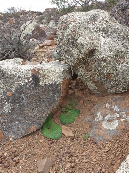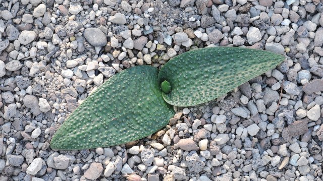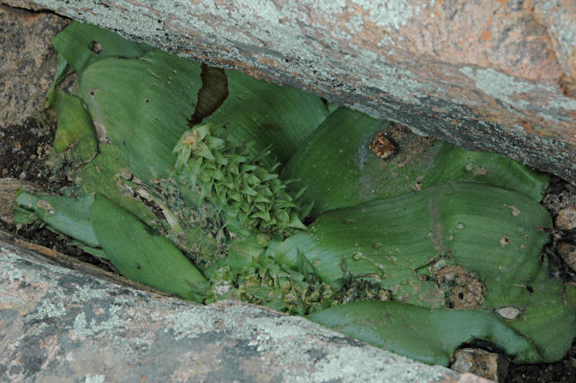 Massonia bifolia (Jacq.) J.C.Manning & Goldblatt (syn. Whiteheadia bifolia (Jacq.) Baker) was reclassified as Massonia based on convincing evidence by Manning, Goldblatt & Fay (2004). In an article published by Mario Martínez-Azorín, Michael Pinter, and Wolfgang Wetschnig in 2015 it was returned to Whiteheadia, but in The genus Massonia Thunb. ex Houtt. (Hyacinthaceae: Scilloideae) in the Core Cape Floristic Region by John Manning published in 2019, it is still included in Massonia and that is the official position of the SANBI (South African National Biodiversity Institute). It grows in arid winter-rainfall areas of southwestern Namibia and the Western Cape Province of South Africa. Growing 8-15 cm high, plants are tucked in under rocks to provide shade and bulb protection. Its cluster of green flowers with a topknot of bracts looks similar to Eucomis. Rodents are said to sip its nectar, and there are lots of rodent droppings to the left of the flower stalk in photo #2 below. Diane Whitehead wrote: "It doesn't arouse enthusiasm in flower writers, and I expected to like it only out of family loyalty, but when I saw it growing, I liked it for its robust self. It flowers in mid-winter in my unheated greenhouse in Victoria B.C., and produces copious seeds." Photos 1-2 were taken by Diane Whitehead in Namaqualand in early September 2006. Photos 3 were taken by Mary Sue Ittner and photo 4 by Bob Rutemoeller at the same time and place.