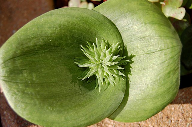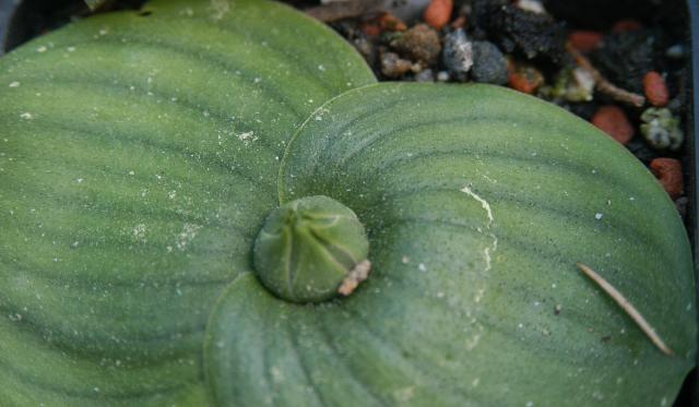 Massonia sp. In the trade this species is known as M. bredasdorpensis n.n.. It is characterized by large glabrous leaves, small flowers and huge seedpods. Photos 1-3 by Mary Sue Ittner show a plant grown from seed labeled as echinata in different stages: bud, flower, seed. In photo 1, it is growing in the same pot with M. longipes. That plant emerges later, has a purplish tinge and is very pustulate, with smaller leaves and more attractive flowers. Every year the leaves of this plant get bigger so that I need fewer to a pot or a bigger pot. The leaves are very attractive, especially if protected from the elements. These plants closely resemble a form sold by Rust-en-Vrede in the 1980-90's that they called Massonia cf. echinata.
