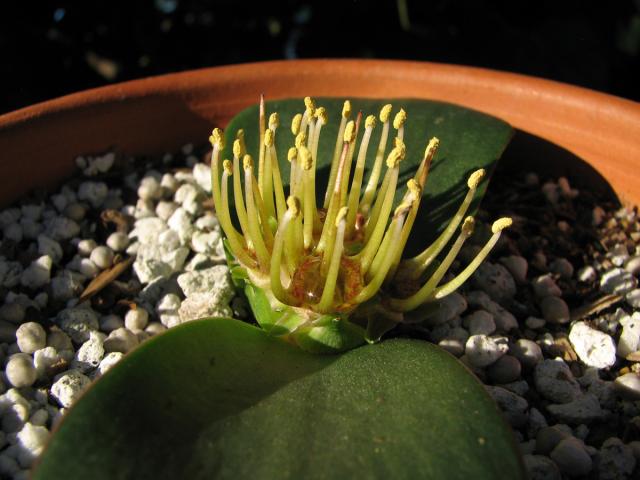 Massonia depressa Houtt. is native to the dry areas of the Cape Province and Namaqualand to the Orange Free State. This species is pollinated by rodents including gerbils. The flowers are low to the ground, dull colored, with a yeasty odor and sucrose-dominant jelly-like nectar that is easy for the rodents to lap. Anthers on this species are more than 2 mm long, longer than on other species in the Cape. Plant height: to 5 cm. A recent paper by Wolfgang Wetschnig et al. STAPFIA 97 (2012): 210–221 proposes relocating some forms of this species to Massonia pustulata but botanists in South Africa who have observed this species in the wild note there is great variation in this species and the paper does not present enough specimens to make this conclusion. We are leaving the names of those plants the names that the photographers used until this is settled. Height range: to about 10 cm. Photos 1-3 taken by Mary Sue Ittner show this species blooming for the first time from seed in a pot that probably should be bigger. Photo 2 is a close-up of the flowers and the last shows the nectar. Photos 4-6 are from Bert Zaalberg.