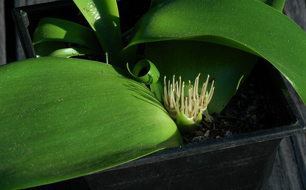 Massonia jasminiflora Burch. ex Baker is confined to the inland areas of eastern South Africa and western Lesotho. The leaves are smooth, the flowers are white, often strongly scented like jasmine. Tepals are spreading and filaments short and connate at their base, forming a tube. Although this species occurs in a summer-rainfall area, it grows and flowers in winter in cultivation. Height: to about 15 cm. Photos 1-4 were taken by Bert Zaalberg from plants in cultivation.