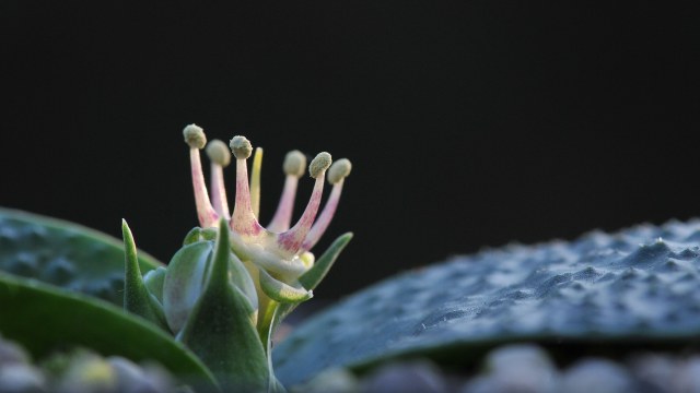 Massonia longipes Baker is a species with pustulate leaves and a coastal distribution. Certain forms can have maroonish streaks or mosaic on a green background to almost completely purple. The flowers are cream to pink and the stamens are 16-24 mm long, with a pink base of the stamens and opening of the floral tube. Density and size of pustules is more heterogenous compared to Massonia pustulata. This species has been grown under the name Massonia pustulata until 2012. See the information under that species to learn how the two species are different. Height: to about 14 cm. Photos 1-4 by Mary Sue Ittner. Photo 1 shows a plant with pustulate leaves and flowers as they first open and then develop. Photos 2-4 show plants in subsequent years and photo 4 shows pollination by a hover fly. Photo 5 by Nhu Nguyen shows a form with completely purple leaves.