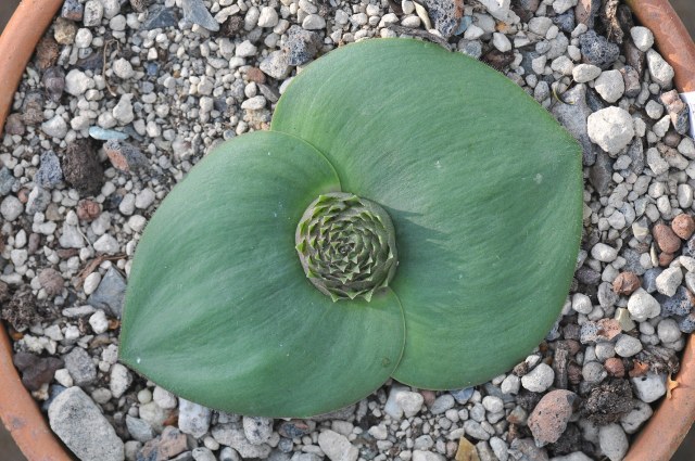 Massonia is a genus in the family Hyacinthaceae or Asparagaceae according to APG III. It was named for Francis Masson, a Scottish student gardener at Kew who was sent to the Cape by Sir Joseph Banks in 1772 to collect seeds. It can be found in dry areas in southern Africa. Species have two prostrate or spreading leaves and a head-like inflorescence at ground level with large and leafy bracts and tubular flowers with the filaments shortly joined together at the base. Most species are winter growers, summer dormant, and bloom early, often in late fall to early winter. Seeds are formed in a three angled (papery) capsule which as it dries elongates and easily lifts out or is detached to disperse the seeds. Summer dormant plants will come out of dormancy on their own in the fall even when water is not given. Massonia species have perennial roots, but they are not as picky about losing them as members of the Amaryllidaceae. Repotting can be done any time, but probably best right before they come into growth. A dry dormancy is required. Cameron McMaster provided interesting information about this genus in an article he wrote for Farmer's Weekly in 2008. Some of the names have changed since then.