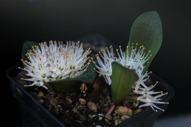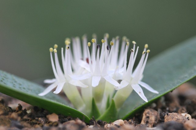 Massonia pygmaea Schltdl. ex Kunth, syns. Neobakeria heterandra Isaac, Massonia heterandra (Isaac) Jessop), is a very dainty little miniature Massonia with short tufts of white flowers between prostrate leaves that usually only up to 30 mm long. Plant height: to 5 cm. There are two subspecies. Best grown in pots, in sandy free draining potting mixture, in full sun. Dry off completely during summer dormancy.