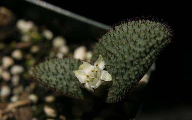 Massonia amoena Mart.-Azorín, M.Pinter & Wetschnig was described in 2014. Distribution is limited to several localities in the Eastern Cape in South Africa. Massonia amoena is closely related to M.jasminiflora but can be easily distinguished by the glaucous green leaves with many darker coloured emergences, the waxy flowers with strongly reflexed tepals and long flower tube. Height: 10 cm. Photos 1-4 are from plants in cultivation by Bert Zaalberg.