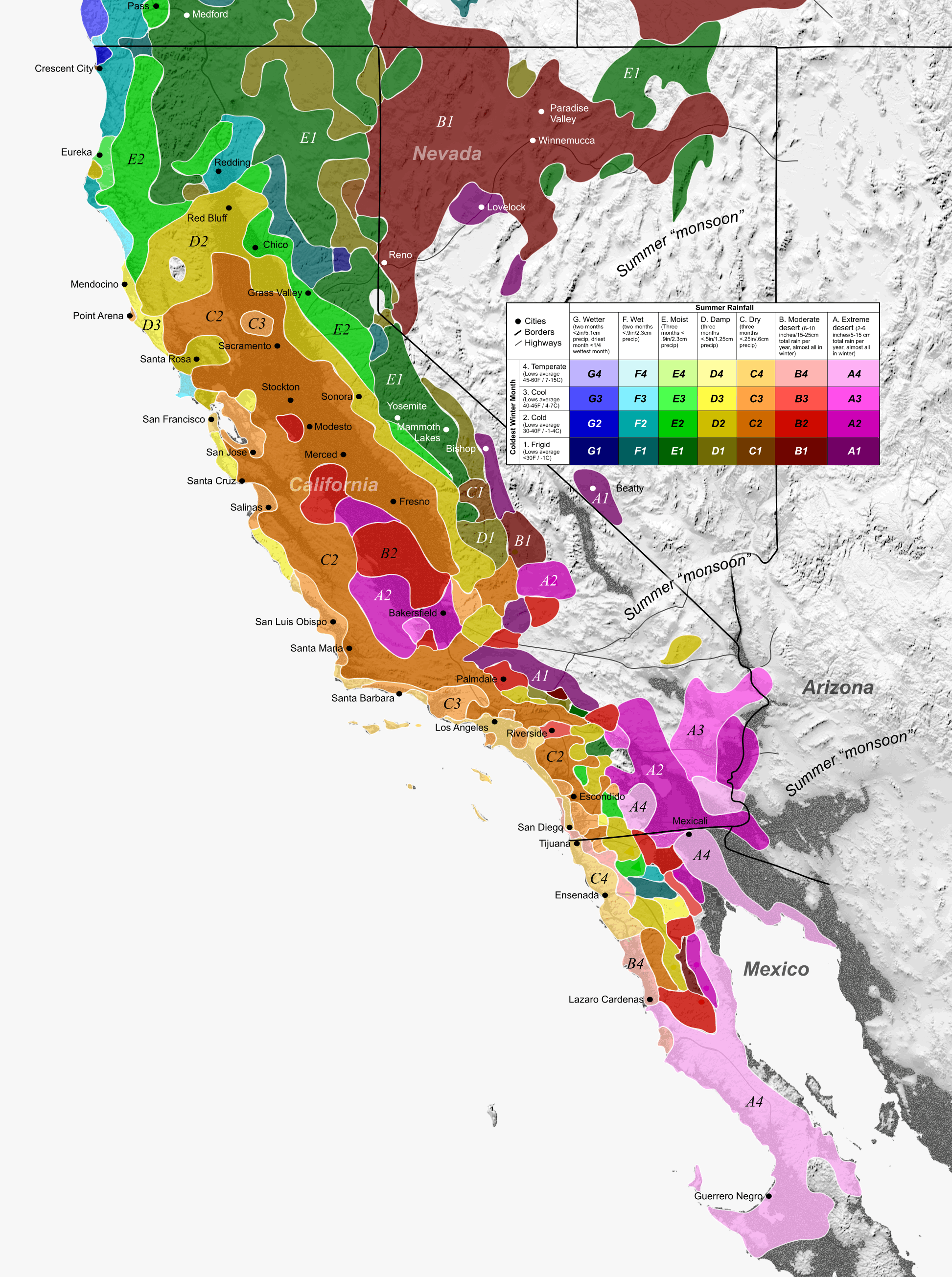 To account for all the variations in rainfall, I made up seven winter rainfall zones. Zones A and B are officially deserts (less than 10 inches of rain per year), with most of their rain falling in the winter. Zone C and D have relatively long summer droughts with very little summer rain in an average year. Zones E, F, and G have shorter summer droughts, with some summer rain.