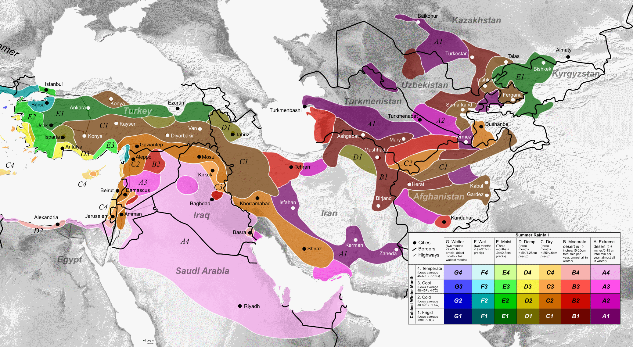 Dark colors in the chart correlate to temperature: the darker the colors are, the colder a place gets in winter. Hue indicates summer rain: reds and purples are the driest areas in summer; greens and blues are the wettest. So an area that's dark purple is a very cold, very dry desert (think Afghanistan); light purple is a dry, warm desert (Baja California).