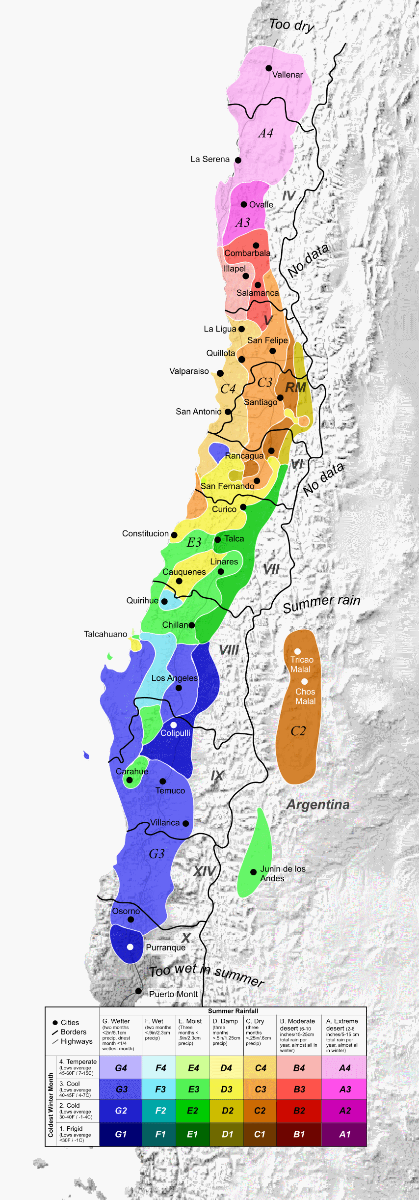 The weather data available online for Chile is sparser than for other countries, and in particular there is almost no weather information for the Andes themselves. I think there are probably some strips of cold summer-dry climate in the mountains to the east of the zones I've drawn, but I can't find any data to document them, so I left those areas blank.