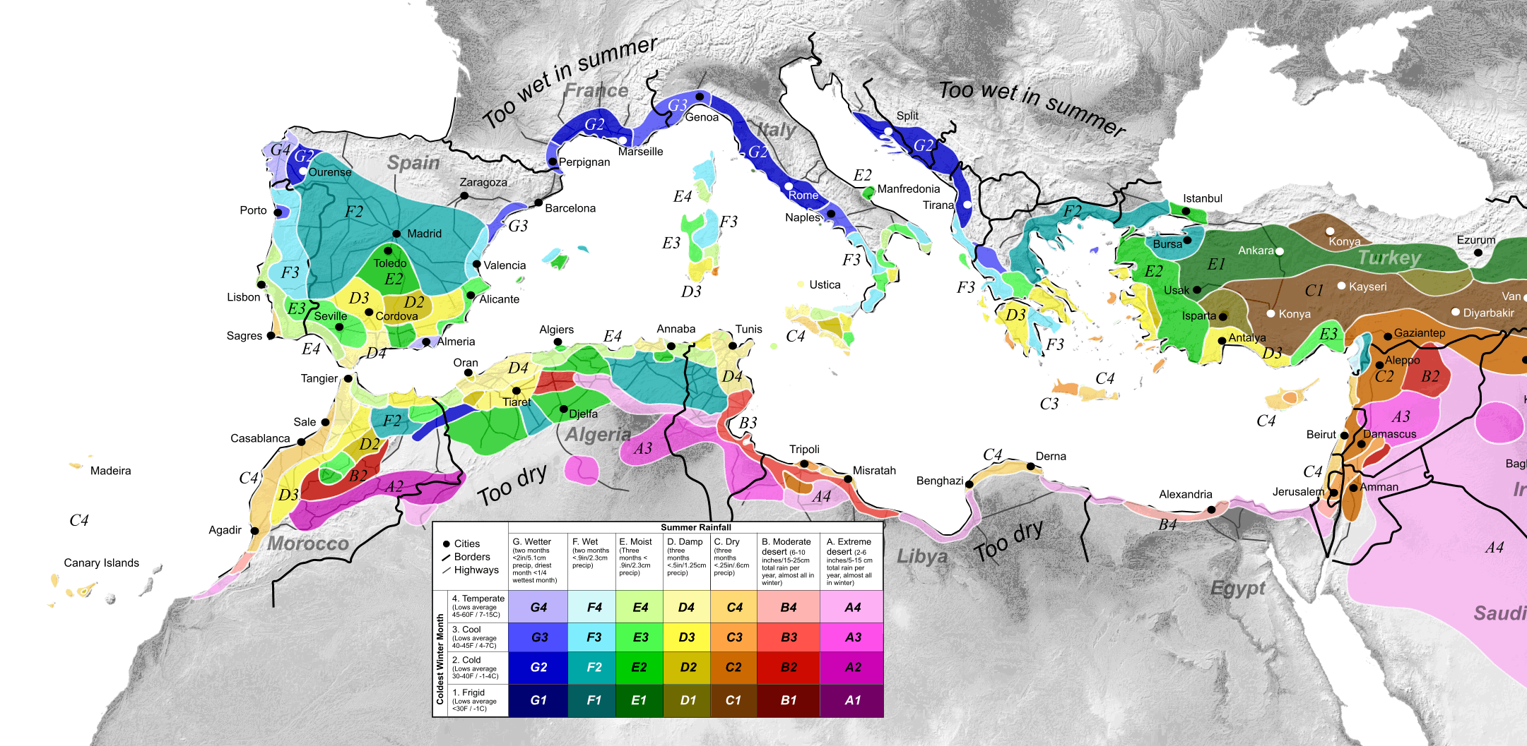 Combine the four cold temperature zones with the seven rainfall zones, and you get a total of 28 summer-dry zones. Because we've included deserts and areas with cold winters, the zones extend beyond the traditional mediterranean areas of the world. A climatologist might be annoyed, but this broader set of zones corresponds much better to the world's summer-dry bulb climates.