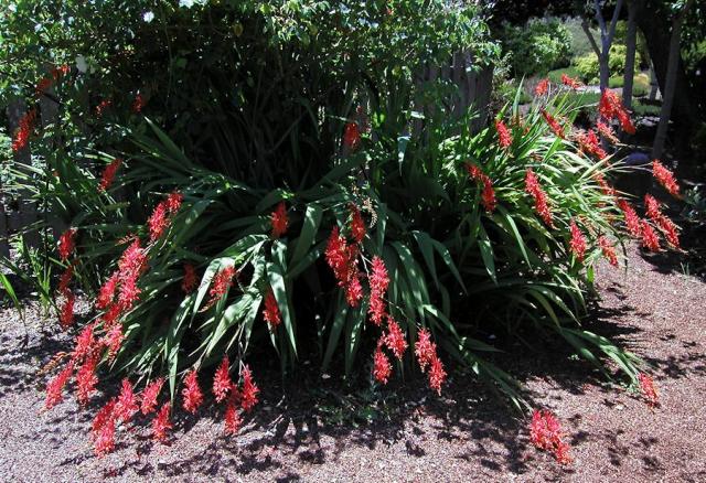Tritonia disticha is a plant from South Africa. The photograph by Bob Rutemoeller shows one blooming in August 2004 combined nicely with a clump of Agapanthus.