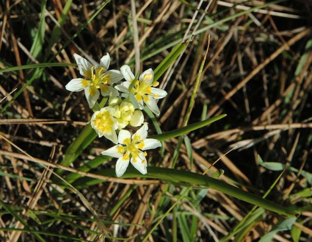 Triteleia peduncularis (long rayed hyacinth) is usually found in vernally wet habitats such as swales, marshes, and temporary streams. Flowering June 2006 in Stornetta Public lands, these plants did not have the long pedicel which so often is used as a distinguishing characteristic of this species. Photos by Bob Rutemoeller and Mary Sue Ittner showing the yellow ovary and distinctive markings on the back.
