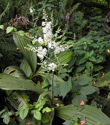 Veratrum fimbriatum known as the Fringed Corn Lily, is rare and restricted to shaded wet places on the Mendocino and Sonoma Coasts. It has white flowers with a yellow base and the petals are fringed. Leaves are large and pleated, emerging in spring, when they make a statement. By the time the plants flower late summer, the leaves can be a bit weathered. Photos below from Bob Rutemoeller and Mary Sue Ittner first show leaves in spring and then flowering in late summer-fall. Habitat companions are: Oxalis oregana, Asarum caudatum and Polystichum munitum.