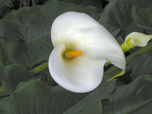 Zantedeschia aethiopica know in California as Calla Lily is native to South Africa, but has naturalized and is found in many places along the coast, including abandoned homesteads. Photos by Mary Sue Ittner show a close up of one in such a place and a grouping found at Salt Point State Park.