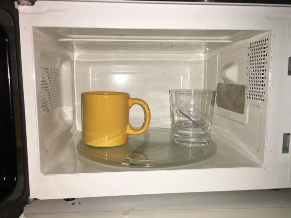 Microwaves behave differently depending on what materials are present inside the oven. This is why the cotton swab is not placed in an empty glass, but standing in 1 cm (about ½ inch) of water, complemented by another volume of water in a separate porcelain mug. This guarantees a more counterbalanced distribution of the microwaves inside the oven. The water in the glass and the mug raises the humidity inside the oven during the process to some extent, thus reducing the drying effect on the pollen; the resulting “steaming effect” might further alter the pollen.