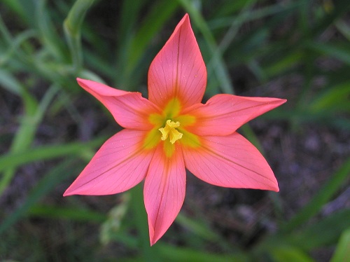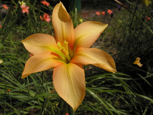 The photos below are of a cross between the orange form of Moraea flaccida and a yellow Homeria, probably Moraea collina. The resulting flowers are a soft peach color, with yellow centers. They have delicate veins on the backs of the tepals. Photos by Michael Mace.