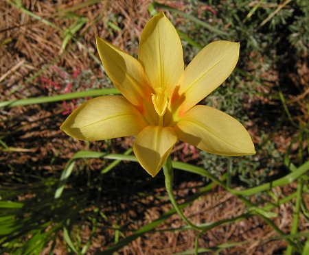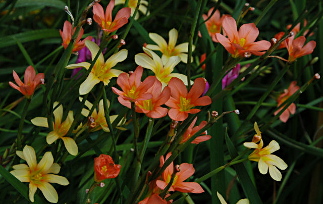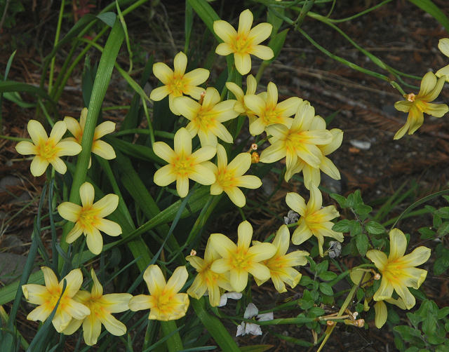 Hybrids in the Homeria subgroup have appeared in Mary Sue Ittner's coastal Northern California garden that probably have Moraea collina, Moraea flaccida or Moraeas ochroleuca in their parentage. These bloom for several months and need to be dead headed so they won't spread. They still increase by forming offset corms. All photos taken in the garden by Bob Rutemoeller.