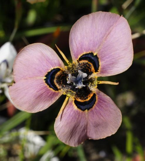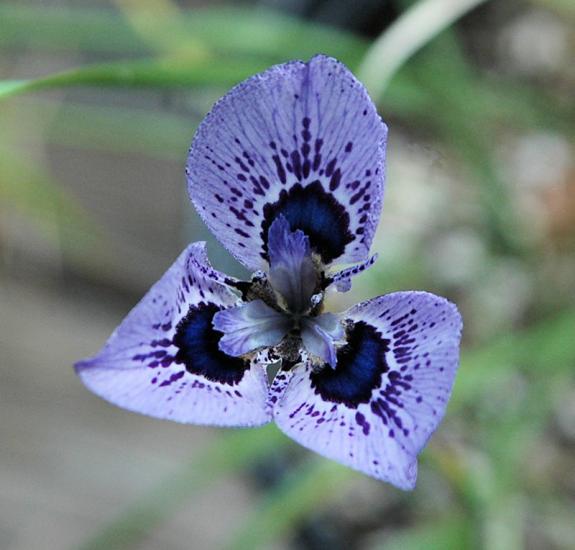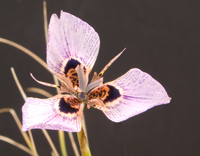 Moraea aristata × Moraea loubseri. This is an accidental hybrid discovered in the garden of Bob Werra. The color scheme is reminiscent of M. loubseri, while the tepal shape is reminiscent of M. aristata.