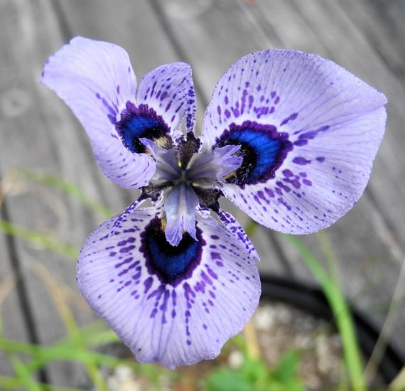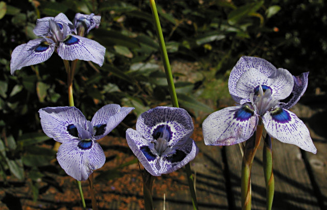 Seed was collected by Mary Sue Ittner of her blooming plants and grown on. She did not hand pollinate so this clone could have been further hybridized with Moraea aristata but she cannot remember if it was blooming at the same time. Below are photos of the results. The stripes remain, but not the bright purple color of the tepals. These hybrids are one of the more reliable bloomers each year in her garden which makes her happy. She is sorry however that she did not keep them all separate as some pots have corms from the original 'Zoe' and the offspring which means more interesting combinations could be created in the future since they bloom at the same time.