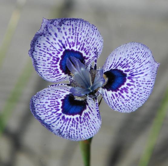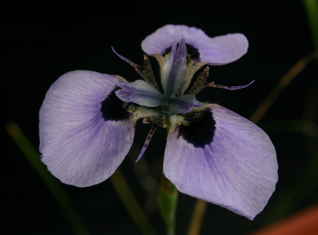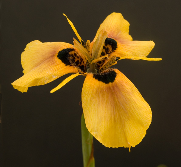 Moraea 'Zoe' is probably the best-known Moraea selection, with spectacular zebra stripes on its tepals. It was grown and photographed by Bill Dijk in New Zealand, who reported that it appeared spontaneously in a patch of open-pollinated Moraea villosa plants. He named this plant Moraea villosa 'Zoe' in honor of New Zealand botanical artist Zoë Carter. It does not have a hairy stem or leaves which are important characteristics of that species, which suggests that it may be a hybrid instead of a cultivar. It shows some similarities to Moraea aristata so could be a hybrid between the two species. But there was a documented report of this color pattern showing up in a wild population of Moraea villosa (see here), and similar color patterns have occasionally shown up in private collections (here). First two photographs by Bill Dijk; second two photographs by Mary Sue Ittner who got her corms from Bill.