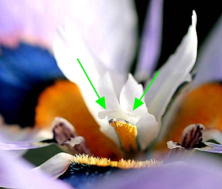 These are pollination photos of some other Moraea species. In the first photo, a flower of Moraea gawleri has been pollinated. The pollen is bright orange, so it's easy to spot. In Moraea gigandra (second photo), the stigmas are at the outer end of the central crest (this flower has been pollinated with orange pollen). In Moraea neopavonia / tulbaghensis (third photo), the stigmas are small horn-like flaps at the end of the central crest. These have been pollinated. In Moraea atropunctata (fourth photo), the stigmas are near the outer end of the crest. Photos 5-7 by M. Gastil-Buhl show the stigmas for Moraea villosa, M. fugax, and M. tripetala. The stigmas in M. tripetala are especially tiny, and you have to pull up the crest of the flower to expose them.
